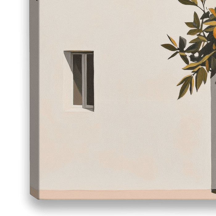 Ein strahlendes Spiel aus gelben Orangen und sanften, cremefarbenen Mauern. Die Fensterblicke scheinen neugierig, während der kräftige Baum mit seinen prallen Früchten einen Hauch von Sommerleichtigkeit verspricht. Diese harmonische Komposition lädt zum Träumen ein und entfaltet eine Atmosphäre ruhevoller Eleganz.