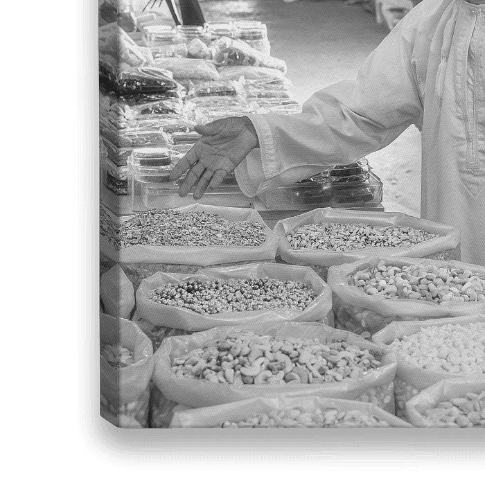 Mann im traditionellen Gewand, der Dishdasha auf einem traditionellen, orientalischen Markt im Oman beim Gewürze kaufen in schwarzweiß