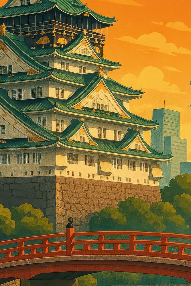 Majestätische Architektur vor einem zauberhaften Sonnenuntergang: Das elegante Osaka Schloss bildet einen harmonischen Kontrast zu den modernen Wolkenkratzern. Der sanfte Fluss und die stilvolle Bootsfahrt verleihen dem Bild eine friedliche Stimmung. Perfekt, um täglich inspiriert zu werden, eignet es sich wunderbar für das Wohnzimmer oder das Büro.