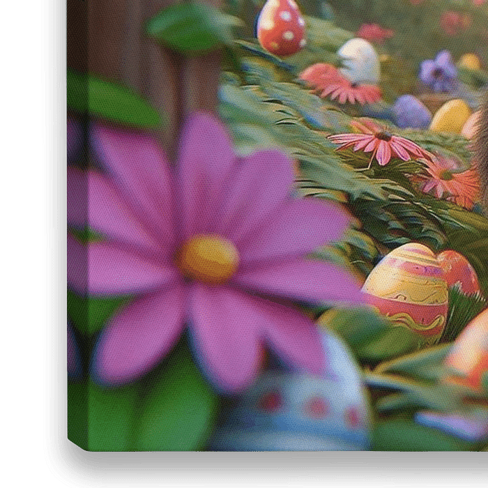 Bestelle dieses Blumen-Wandbild Ostereiersuche im blühenden Garten von artefacti als Reproduktion auf Leinwand, Alu-Dibond, als Poster, Fototapete oder Acrylglasbild.