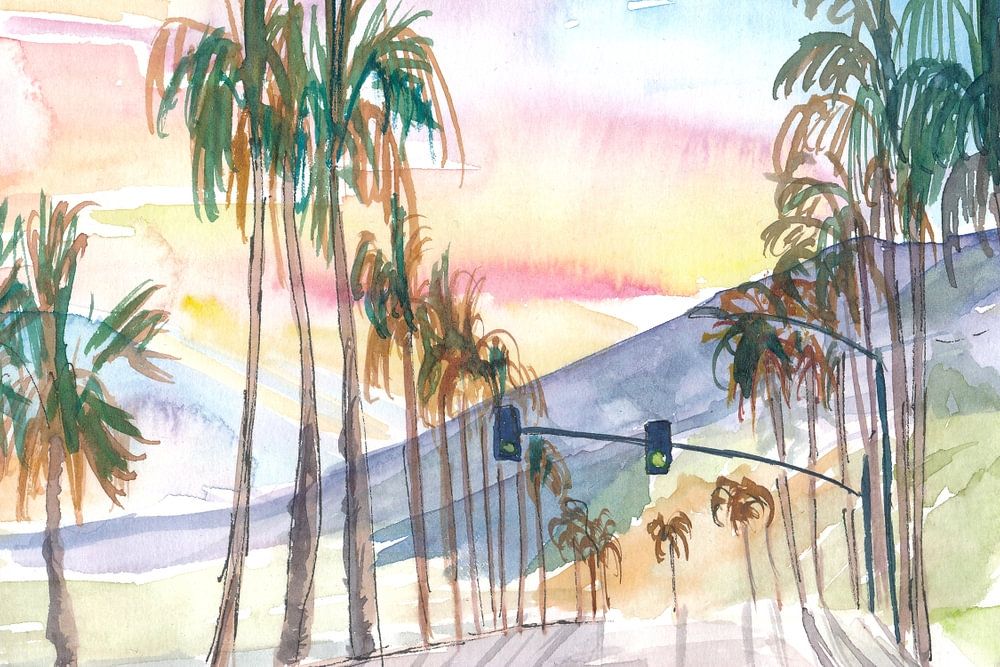 Palm Springs Avenue mit kalifornischem Sonnenuntergang