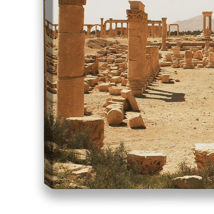 Syrien - Dieses Bild zeigt eine Szene, die wirkt, als sei die Zeit stehen geblieben. Inmitten der weiten Wüstenlandschaft Syriens recken sich die steinernen Säulen von Palmyra in den blauen Himmel – aufrecht, würdevoll, als wollten sie noch immer von der einstigen Größe dieser Stadt künden. Im Hintergrund zeichnen sich Wachtürme und Reste weiterer Bauwerke ab, eingebettet in eine Landschaft, die fast außerweltlich erscheint.Die Harmonie zwischen Natur und Architektur ist hier besonders spürbar. Die sanften Hügel, das gleichmäßige Licht, die Schatten der Kapitelle – alles erzählt von einem Ort, der viel gesehen und noch mehr überstanden hat. Palmyra war nicht nur Handelszentrum, sondern auch kultureller Leuchtturm. Wer hier verweilte, erlebte einen Schmelztiegel der Zivilisationen. Heute ist dieser Ort ein stiller Zeuge vergangener Größe – und dieses Bild ein Fenster in eine Welt, die man sonst nur aus Geschichtsbüchern kennt. Für Liebhaber antiker Ästhetik, Wüstenlandschaften und monumentaler Stille. Ein Kunstwerk, das in jedem Raum eine Brücke zwischen Vergangenheit und Gegenwart schlägt.