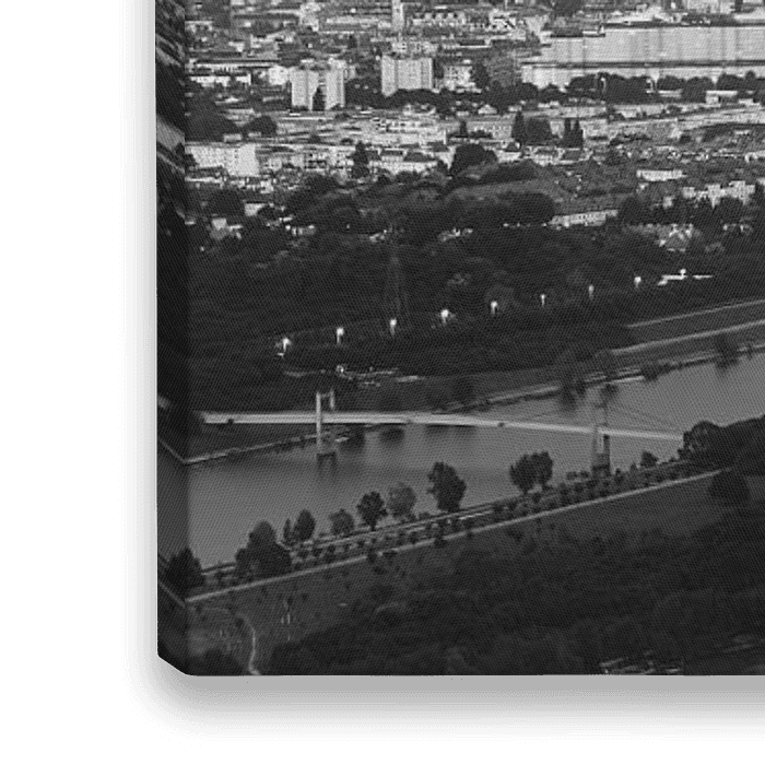 Ein großartiges und weitläufiges Panoramabild in Schwarz-Weiß von der Aussicht auf Wien, Österreichs Hauptstadt. Das Bild wurde vom Gipfel des Leopoldsbergs nach Sonnenuntergang aufgenommen.