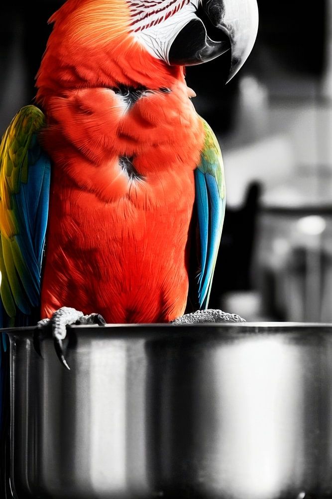 Inmitten einer monochromen Küchenlandschaft erhebt sich ein leuchtender Ara majestätisch aus dem Kochtopf – ein wilder Mix aus Farben und Lebensfreude! Seine lebhaften Federkleider kontrastieren gewaltig mit dem schlichten Metall. Dieses lebhafte Kunstwerk bringt eine fröhliche Note in die Küche und weckt den Charme eines exotischen Paradieses.