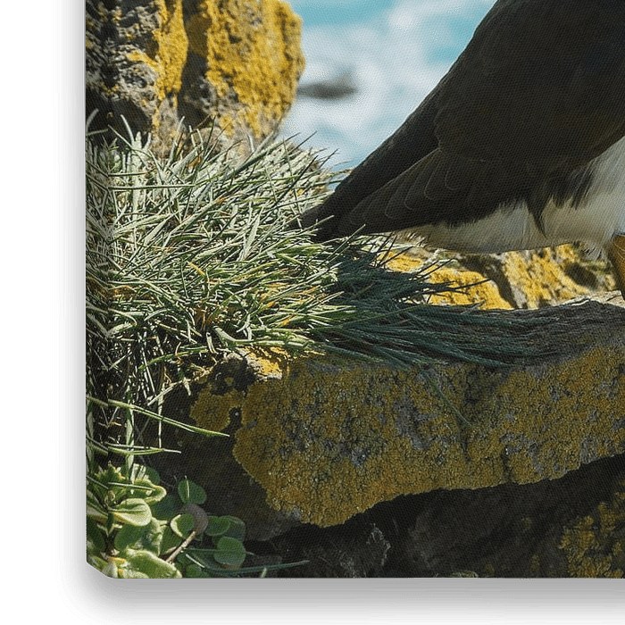 Ein Papageientaucher auf einem Felsen mit dem Meer im Hintergrund. Das Foto wurde in Island bei Latrabjarg aufgenommen, wo in den Sommermonaten die größte Kolonie von Papageientauchern brütet. Die Vögel kommen aus dem Meer, um dort zu brüten.
