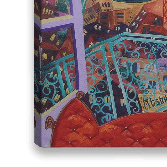 Die untergehende Sonne in Paris, der Abend beginnt auf dem Balkon mit Blick auf das Highlight von Paris, ein nicht gerade standardmäßig gedeckter Tisch, aber das tut der Aussicht auf Paris keinen Abbruch, Matisse/Soutine/Hockney/Picasso sind in Farbe und Form als Inspiration in das Bild eingewoben. Die Katze beobachtet den Betrachter etwas ahnungslos, die offenen Fenster laden den Betrachter in diese metaphysische Welt ein. Jeder, der schon einmal in Paris war, wird die Gebäude, die Dächer, die Farben wiedererkennen, ein ruhiger Moment in einer Metropole, die nichts von ihrer Anziehungskraft eingebüßt hat, ein Streifzug durch die Stadt, in der die zeitgenössische Kunst erfunden wurde, in der Armut und Erfolg Hand in Hand gehen, in der so mancher Künstler mittellos gestorben ist, sein Werk aber weiterlebt und als Inspiration für die nächste Generation dient