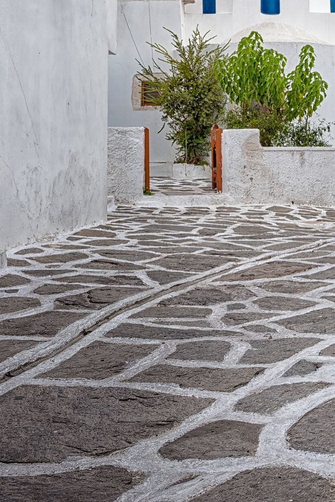 Ein schmaler kopfsteingepflasterter Weg schlängelt sich zwischen weiß getünchten Gebäuden hindurch und führt zu einem für die Kykladenarchitektur typischen Gebäude mit blauer Kuppel. Sanftes Sonnenlicht unterstreicht die ruhige und charmante Atmosphäre der Szene.