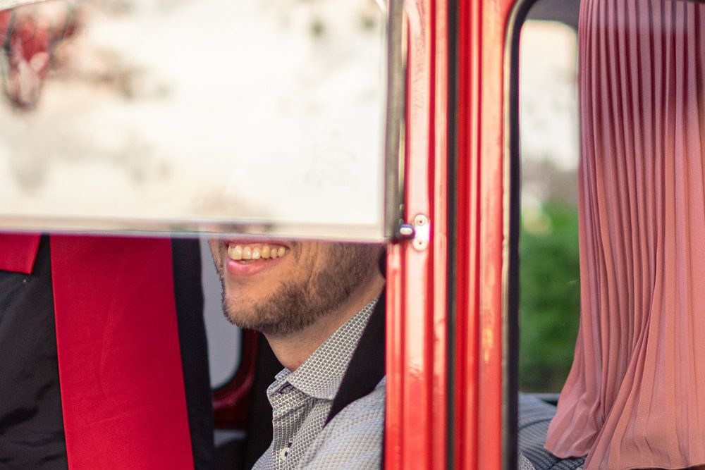 Die Kinder sitzen in einem 2CV, während der Vater am Steuer sitzt.