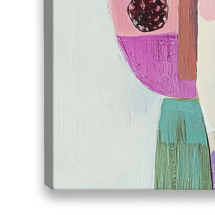Pastellporträts | Gesichter Pastell - Dieses abstrakte Gemälde mit Gesichtern kombiniert üppige Pastellfarben und ausdrucksstarke Linien, die vier stilisierte Porträts miteinander verbinden. Jedes dieser Porträts hat ein charakteristisches Accessoire oder Motiv, wie z. B. eine Blume, eine Frucht und geometrische Muster.