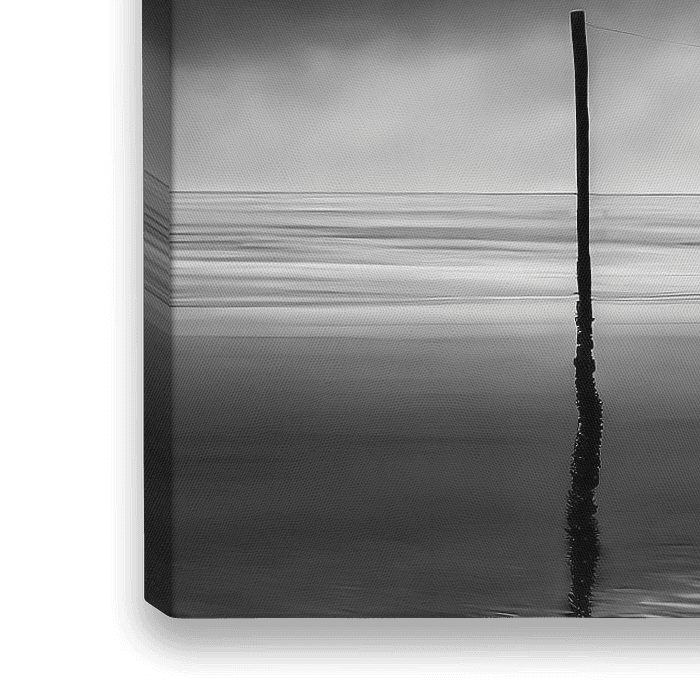 Dunkle Wolken ragen über einem einsamen Menschen auf, der an einem einsamen Strand steht, an dem eine Reihe verwitterter Pfosten ins Wasser ragt. Die monochrome Szene strahlt ein Gefühl der Ruhe und Isolation aus....Das Digitalart-Bild wurde von mir designt, und zwar durch Composing, generative KI und Retusche.