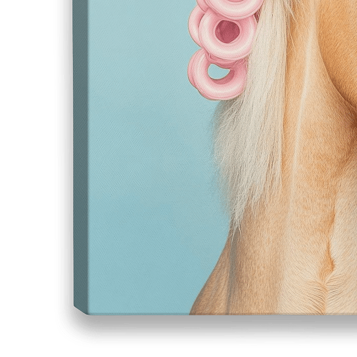 Mit einem Hauch von Extravaganz präsentiert sich ein stolzes Pferd, dessen goldene Mähne mit zarten, rosafarbenen Lockenwicklern geschmückt ist. Der sanfte Blick und die elegante Haltung verleihen ihm eine almost königliche Anmut, während der zarte Hintergrund die verspielte Farbkombination perfekt zur Geltung bringt. Ein wahrhaft…