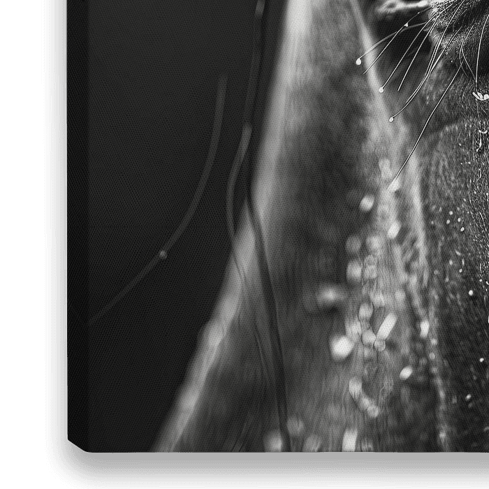 Detailreiche Schwarz-Weiß-Aufnahme eines Pferdeauges mit Tropfen auf dem Fell.