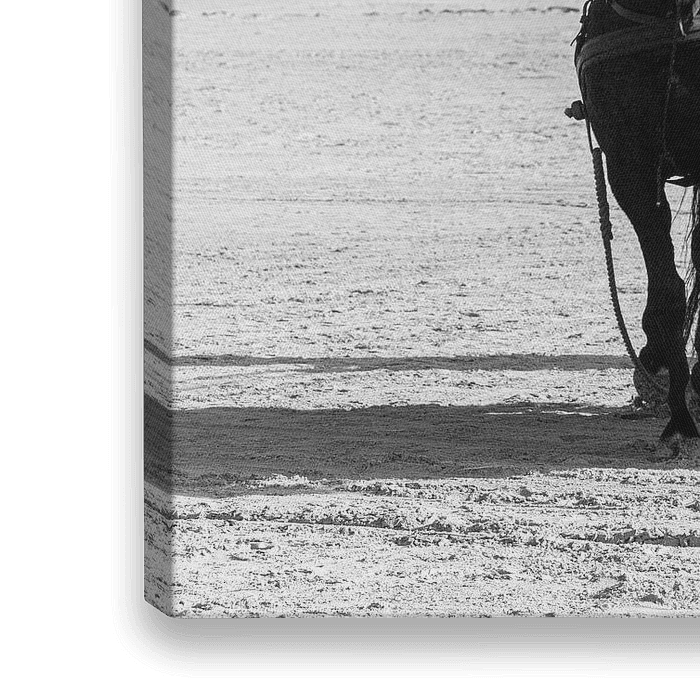 Ein Gespann aus vier Pferden am Strand bei Hollum auf der Watteninsel Ameland während einer Vorführung des Rettungsbootes Abraham Fock. Vier Pferde maritimes Zentrum Abraham Fock. Foto in schwarz/weiß. Dieses Foto wurde im Februar 2014 aufgenommen.