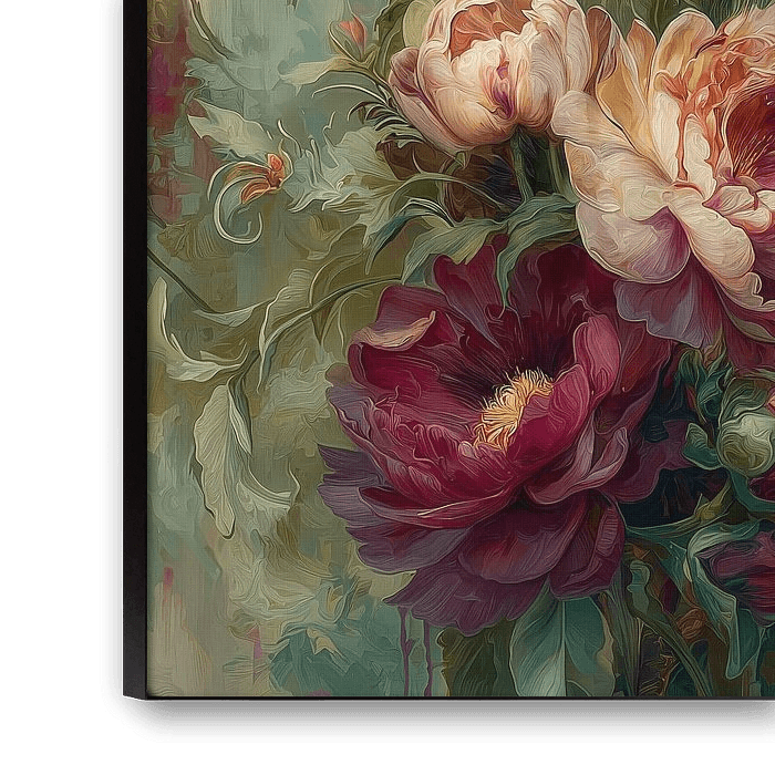 Ein stattlicher Pfau in leuchtend türkisfarbenem Gefieder thront majestätisch inmitten üppiger Pfingstrosen in verschiedenen Rosa- und Burgundertönen. Dieses klassische Gemälde strahlt zeitlose Eleganz aus; seine dramatische Komposition wird durch einen warmen goldenen Hintergrund und anmutige Pflanzenelemente unterstrichen. Die detailreiche Darstellung und die romantische Farbpalette vereinen sich zu einer erhabenen Atmosphäre, die an die Pracht historischer Interieurs erinnert.