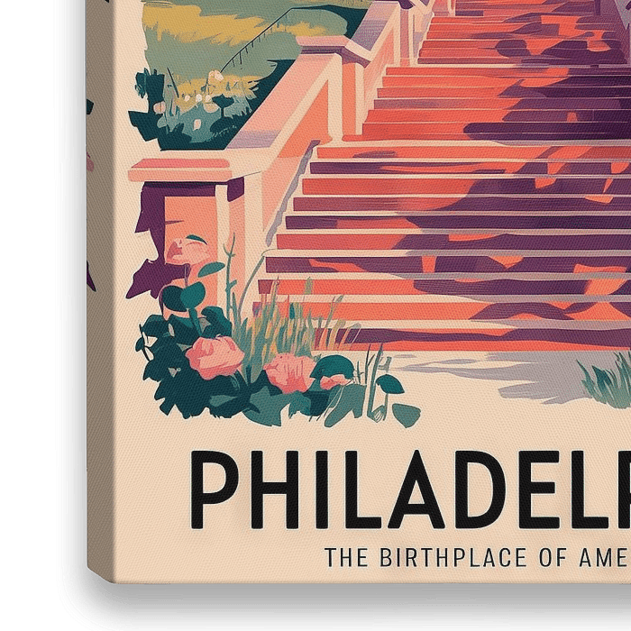 Ein malerischer Sonnenuntergang umrahmt die imposanten Treppen eines historischen Gebäudes, umgeben von üppigem Grün und blühenden Sträuchern. Die lebendigen Farben und die elegante Architektur verkörpern den Geist von Philadelphia. Ideal für das Wohnzimmer, bringt dieses Kunstwerk einen Hauch von Kultur und Geschichte in Ihren Alltag.