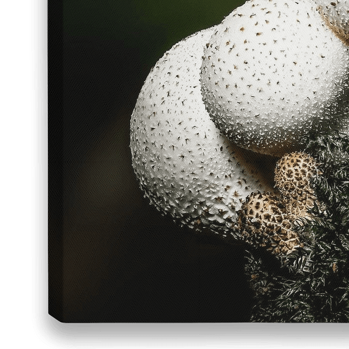 Makrofotografie einer Gruppe essbarer Pilze mit dem Namen Flaschen-Stäublinge (LYCOPERDON PERLATUM). Dieses Motiv ist nicht nur als Wandbild, sondern auch auch als Poster oder Fototapete geeignet.
