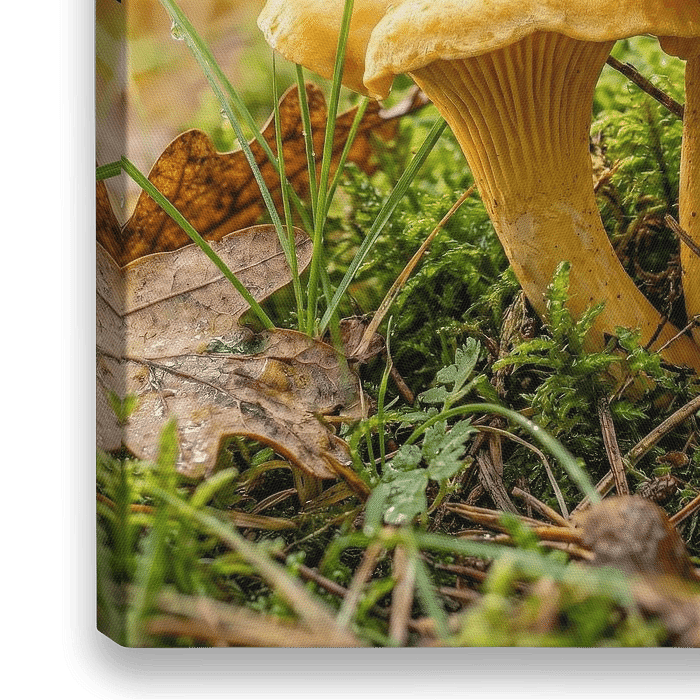 Dieses Wandbild zeigt die Schönheit eines Moments, der meist ungesehen im Verborgenen des Waldes passiert. Drei leuchtend gelbe Pfifferlinge erheben sich aus einem dichten Teppich aus Moos, Laub und feinen Gräsern. Das weiche Licht eines Waldmorgens legt sich wie ein goldener Schleier über die Szene, lässt die Pilzhüte glänzen und…