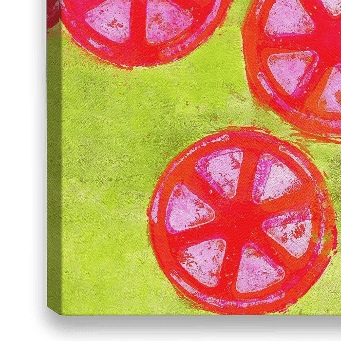Pink Grapefruit twist ist ein Acrylgemälde im Hochformat gemalt von der Künstlerin Karen Kaspar. Auf einem abstrakten Hintergrund in saftigem hellem Grün tanzen Scheiben von frischen saftigen Grapefruits in leuchtendem Pink.