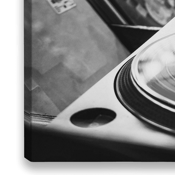 Bestelle das Foto Plattenspieler Vinyl Schallplatten in Schwarz und Weiß von Andreea Eva Herczegh als Reproduktion auf Leinwand, Alu-Dibond, als Poster, Fototapete oder Acrylglasbild.
