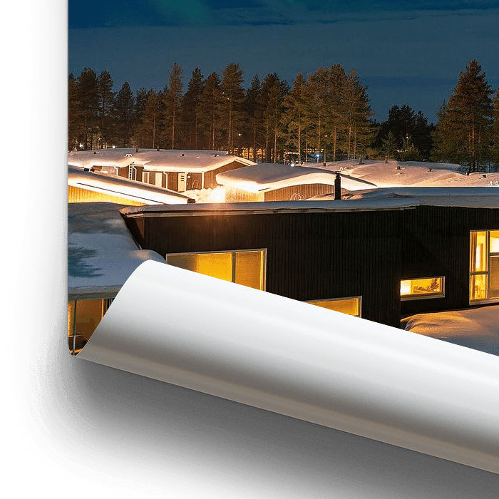 Bestelle dieses Landschafts-Wandbild Polarlicht über Hütten im Winter in Kuusamo, Finnland von Rico Ködder als Reproduktion auf Leinwand, Alu-Dibond, als Poster, Fototapete oder Acrylglasbild.