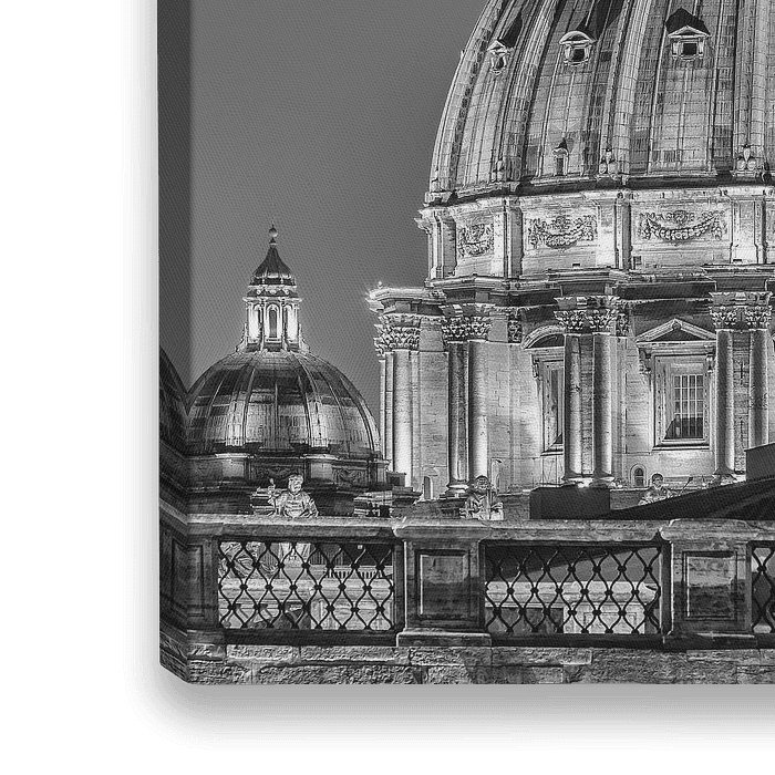 Ponte Sant Angelo und der Petersdom in Schwarz-Weiß, Rom, Italien. Die Päpstliche Basilika St. Peter im Vatikan, oder einfach der Petersdom, ist eine italienische Renaissancekirche in der Vatikanstadt, der päpstlichen Enklave in der Stadt Rom.