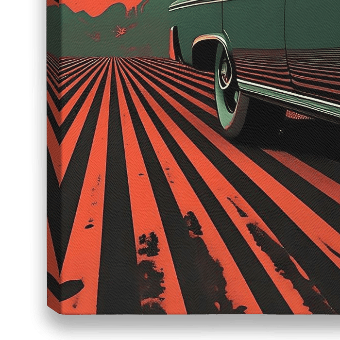 Das Auto im Stil eines leuchtend grünen und schwarzen Op-Art-Posters ist ein optisches Spektakel auf Rädern. Die Karosserie des Wagens leuchtet tief und hell wie ein fluoreszierender Schein in einem auffallend hellen Grün. Dies steht in scharfem Kontrast zu dem tiefen, dunklen Schwarz, das strategisch platziert wurde, um geometrische…