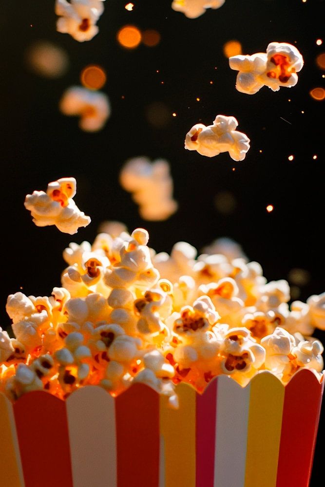 Ein sprudelndes Fest der Farben und Formen: Luftigleich springt das frisch gepoppte Popcorn aus dem bunten Becher und entfaltet seine verführerische Knusprigkeit. Dieses Bild bringt einen Hauch von Gemütlichkeit und Spaß in jede Küche oder das heimische Kino, perfekt für magische Filmabende mit der Familie oder Freunden.