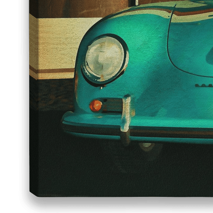 Ein Porsche 356, einer der ersten Porsches und die Basis des legendären Porsche 911, steht zusammen mit zwei amerikanischen Oldtimern in einer alten Tankstelle. Es ist eindeutig ein Sommertag, was man an dem Sonnenlicht erkennen kann, das die Szene durchflutet.