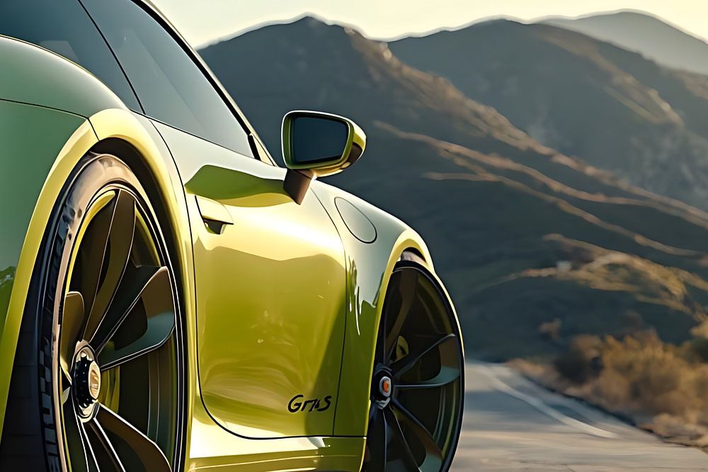 Ein Porsche 911 GT3 rast durch die weite amerikanische Landschaft, entlang der endlosen geraden Straßen des Wüstensüdwestens, wo rote Felsformationen und Kakteen den Horizont beherrschen. Der glänzende Sportwagen wirbelt Staub auf, während er über menschenleere Highways rast, sein Motor röhrt tief und kraftvoll. Unter freiem Himmel, wo die Sonne tief am Horizont steht, kontrastiert die moderne Schönheit des GT3 perfekt mit der rauen, wilden Landschaft Amerikas.
