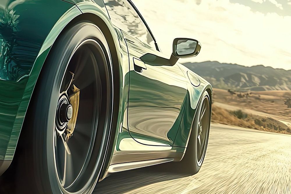 Ein Porsche 911 GT3 rast durch die weite amerikanische Landschaft, entlang der endlosen geraden Straßen des Wüstensüdwestens, wo rote Felsformationen und Kakteen den Horizont beherrschen. Der glänzende Sportwagen wirbelt Staub auf, während er über menschenleere Highways rast, sein Motor röhrt tief und kraftvoll. Unter freiem Himmel, wo die Sonne tief am Horizont steht, kontrastiert die moderne Schönheit des GT3 perfekt mit der rauen, wilden Landschaft Amerikas.