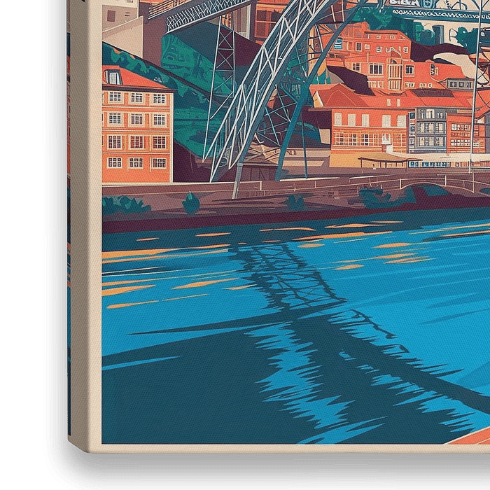 Ein faszinierendes Zusammenspiel von Farben und Formen entführt den Betrachter nach Porto. Die majestätische Brücke, die sich über den glitzernden Fluss spannt, vereint modernistische Architektur mit der historischen Kulisse der Stadt. Die warmen Töne der Gebäude verleihen dieser lebhaften Szene einen einladenden Charakter, während der…