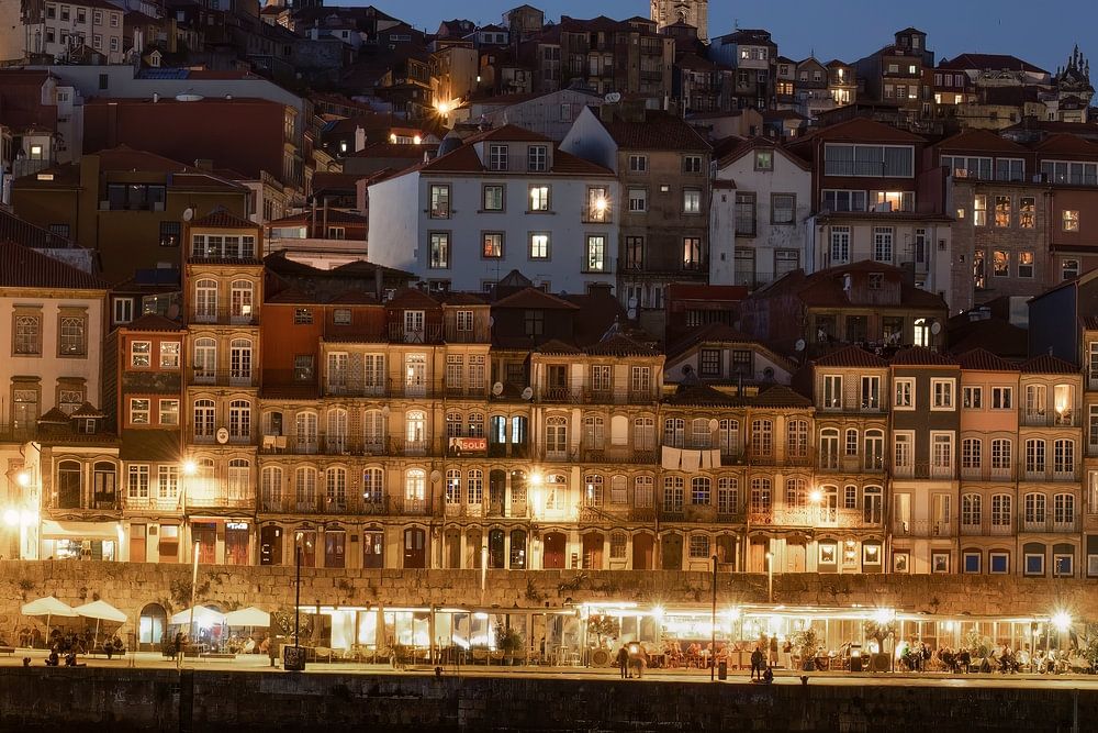 Die Altstadt von Porto mit ihren beleuchteten Fenstern am Hafen zeigt die Lebendigkeit dieser faszinierenden Stadt, die auch Abend und Nacht beherrscht. Das Licht der Laternen und Häuser spiegelt sich im Wasser des Duero.