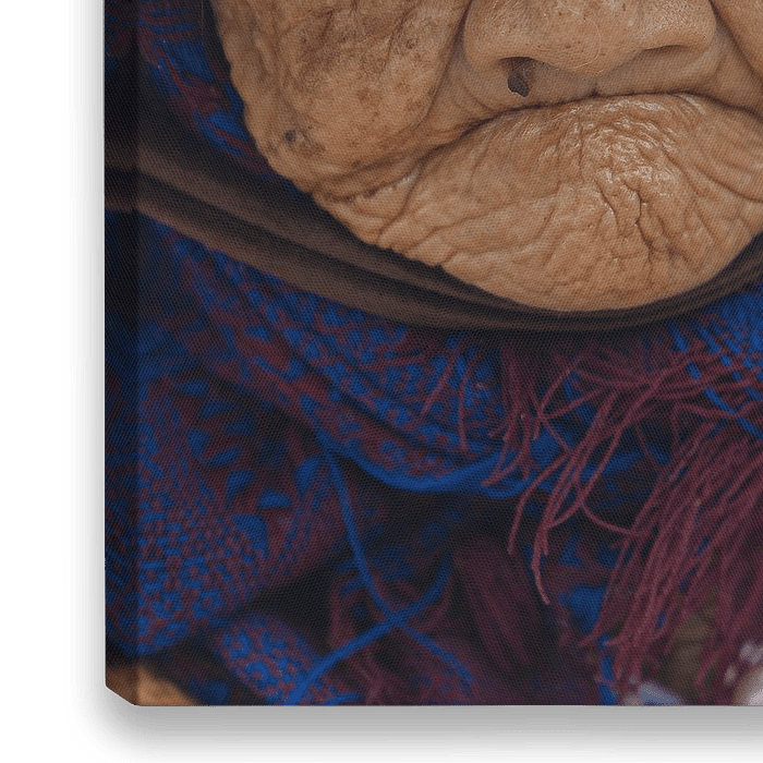 Ein Nahaufnahme-Portrait einer alten Dame mit Katarakt, die einen konischen Hut trägt. Fotografiert auf der Straße in Hoi An, Vietnam.