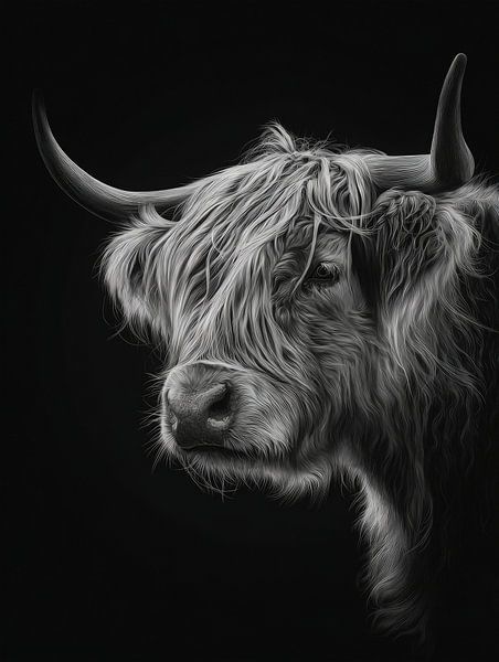 Bestelle dieses Schottische Hochlandrind Wandbild Porträt eines schottischen Hochländers in detailliertem monochromen Stil von But First Framing als Reproduktion auf Leinwand, Alu-Dibond, als Poster, Fototapete oder Acrylglasbild.