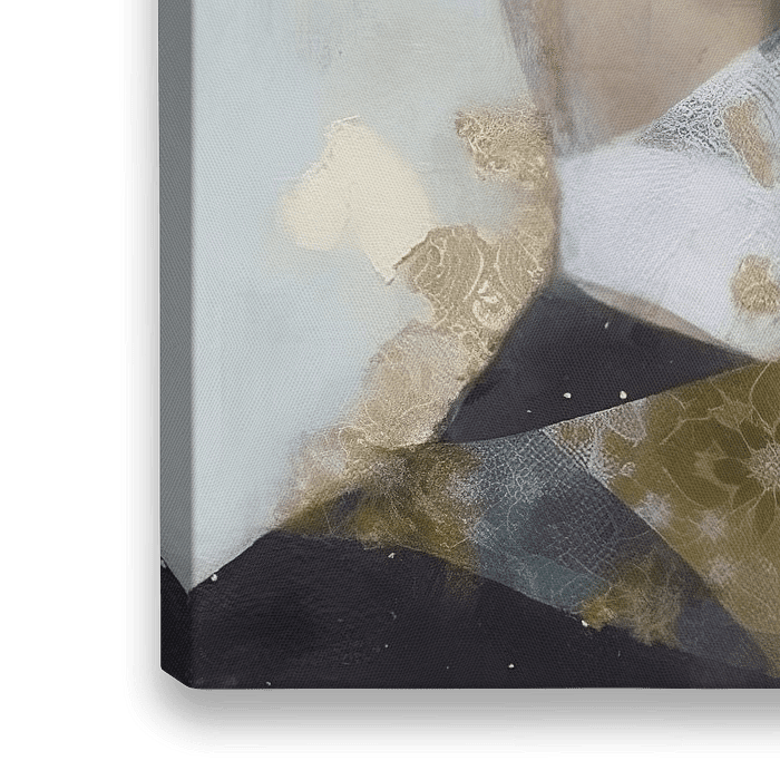 Porträt einer jungen Frau von hinten gesehen. Ein heiterer und poetischer Blick. Sanfte Farben mit goldenen Akzenten. Mit diesem Werk holen Sie sich wirklich etwas Besonderes in Ihr Zuhause!