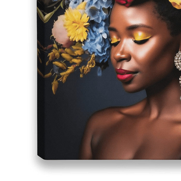 Porträt einer schönen jungen Frau mit einer Explosion von Blumen in verschiedenen Farben wie Rosa, Gelb, Blau und Rot.