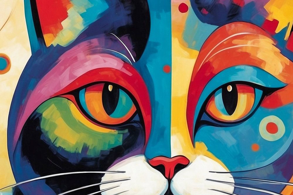Dies ist ein digitales Kunstwerk von einem Porträt einer Katze. Ein abstraktes modernes Bild mit hellen Farben. Ein fröhliches und farbenfrohes Bild, das sich für jeden Raum eignet.