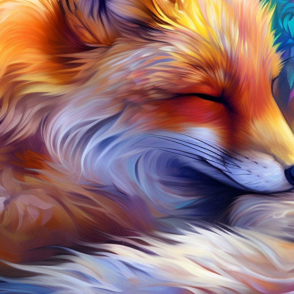 Das fantasievolle und farbenprächtige Porträt zeigt einen schlafenden Fuchs, dessen Fell in leuchtenden Gelb-, Orange- und Rottönen erstrahlt und sanft in Weiß und Violett übergeht. Um den Fuchs herum wirbeln abstrakte Farbwirbel in Blau, Türkis und Pink, die eine magische und träumerische Atmosphäre erzeugen. Das Gesicht des Fuchses ist friedlich und seine Augen sind geschlossen. Die Komposition ist dynamisch und verwendet leuchtende Farben, um die Schönheit und Ruhe des Tieres hervorzuheben.