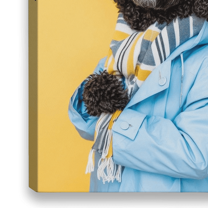 Ein stilsicherer kleiner Charmeur mit lockigem, schwarzem Fell, der stolz in einem blauen Mantel und einem gestreiften Hut posiert. Sein schelmischer Blick und die farbenfrohe Schals verleihen ihm eine fröhliche Eleganz. Unter dem strahlenden Gelb des Hintergrunds strahlt seine Persönlichkeit vor Lebensfreude und Quirligkeit!