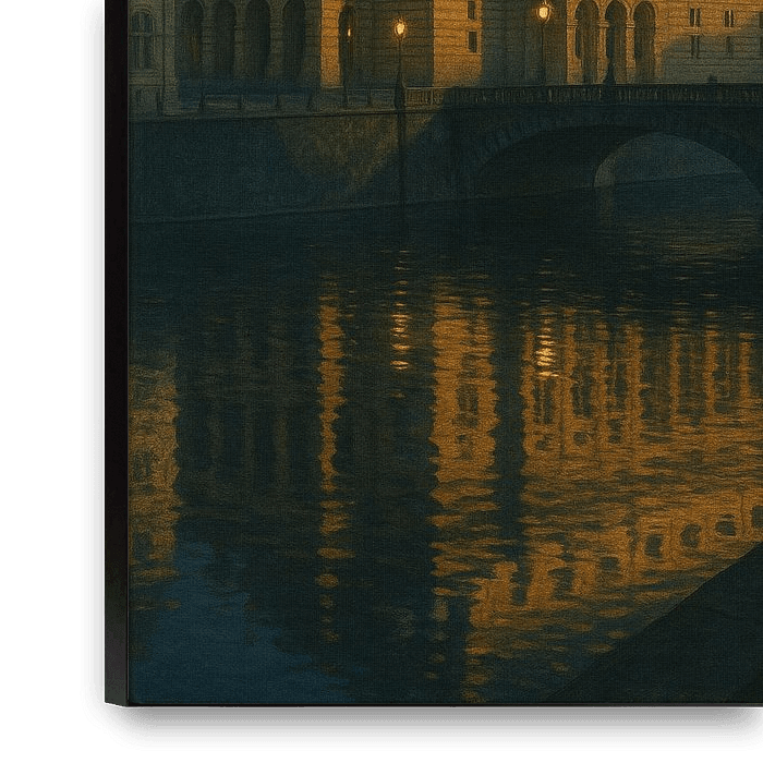 Dieses majestätische Kunstwerk zeigt die Neorenaissance-Pracht des Prager Nationaltheaters (Národní divadlo), das wie ein Schmuckkästchen vor dem sich vertiefenden Blau des Dämmerungshimmels leuchtet. Die kunstvolle Fassade des Gebäudes mit ihrem Rhythmus aus Säulen, Statuen und Goldverzierungen wird in das satte, gesättigte Licht der…