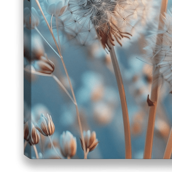 Drei Pusteblumen auf blauen Hintergrund, ein harmonisches Bild, das Ruhe und Natürlichkeit in den Raum bringt.