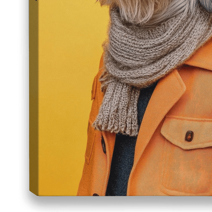 Elegant und charmant präsentiert sich dieser Pyrenäenhund in seinem modischen Outfit. Die grauen, wuscheligen Ohren rahmen ein freundliches Gesicht mit ausdrucksvollen Augen ein. Ein schickes Kapperl und ein stilvoller Schal verleihen ihm einen Hauch von Klasse, während die leuchtend orangefarbene Jacke ihm das gewisse Etwas verleiht.…