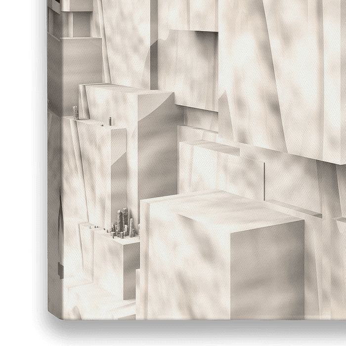 Ein dekoratives kubistisches 3D Motiv mit mit räumlicher Tiefe und einer Textur ähnlich dem Schattenspiel von Blättern eines Baumes, durch die das Licht der Sonne scheint. Ergänzt wird das Bild durch kleine Sandsteine, welche dezent auf einigen der Quader plaziert sind und so den Betrachter immer neue Details des Bildes erschließen…