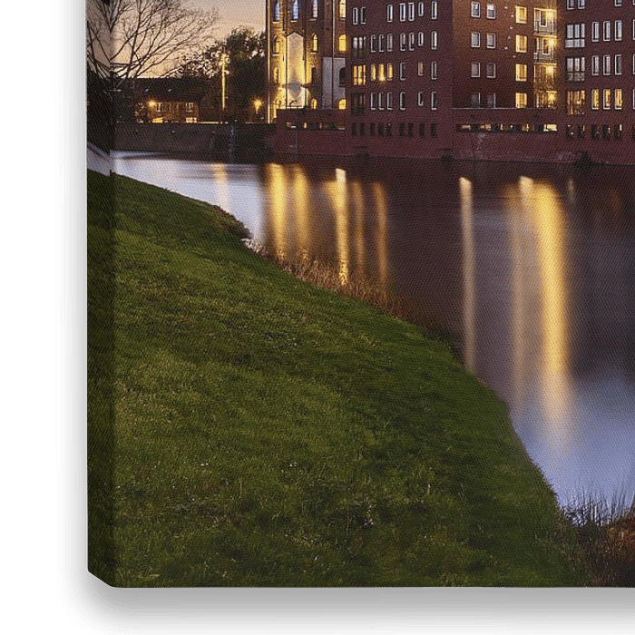 Das Raambuurt in Deventer ist ein ehemaliger Industriebezirk, der in moderne Wohnungen umgewandelt wurde. Die Gebäude befinden sich an der Buitengracht in der Nähe des Bergpoort, einer der Zufahrtsstraßen zum historischen Zentrum. Wir sehen den Raambuurt hier am Abend während der blauen Stunde.