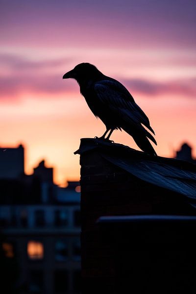In eleganter Silhouette erhebt sich ein schwarzer Rabe vor einem magischen Abendhimmel, der in sanften Violett- und Orangetönen leuchtet. Dieses mystische Moment vermittelt eine Atmosphäre von Geheimnissen und Ruhe. Ideal zur Bereicherung eines Schlafzimmers, in dem Träume und Fantasie miteinander verschmelzen, und den Raum mit einer…