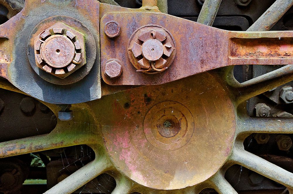 Rostiges eisernes Antriebsrad und -stange einer ausgemusterten Dampflokomotive