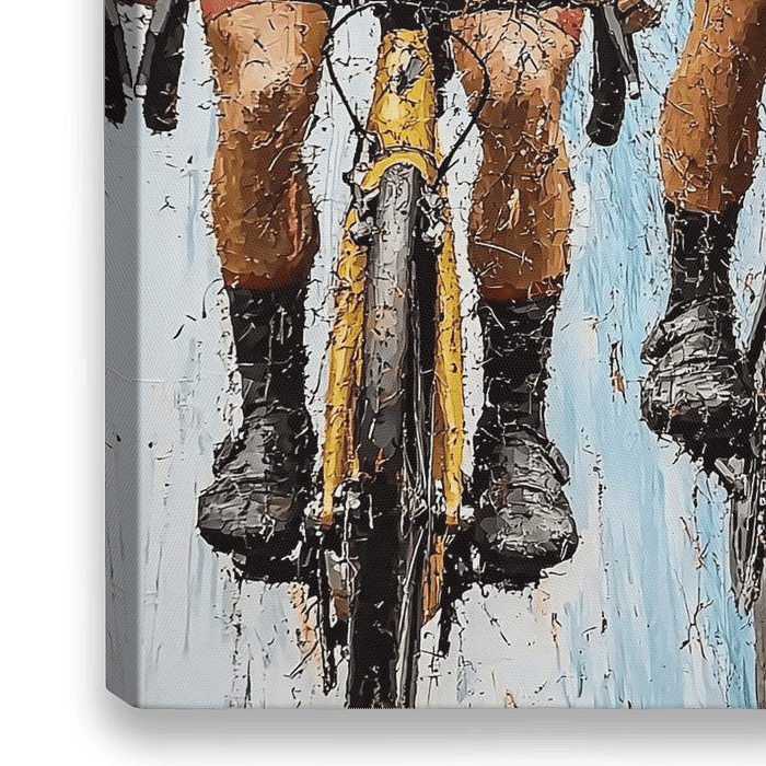 Zwei Radfahrer rasen Seite an Seite auf einer kurvenreichen Straße inmitten einer regennassen Landschaft. Ihre farbenfrohen Trikots bilden einen schönen Kontrast zu der grünen Umgebung und dem Himmel. Die Dynamik des Gemäldes fängt die Geschwindigkeit und Aufregung des Rennens ein, während die Schatten auf der Straße die Tiefe und…
