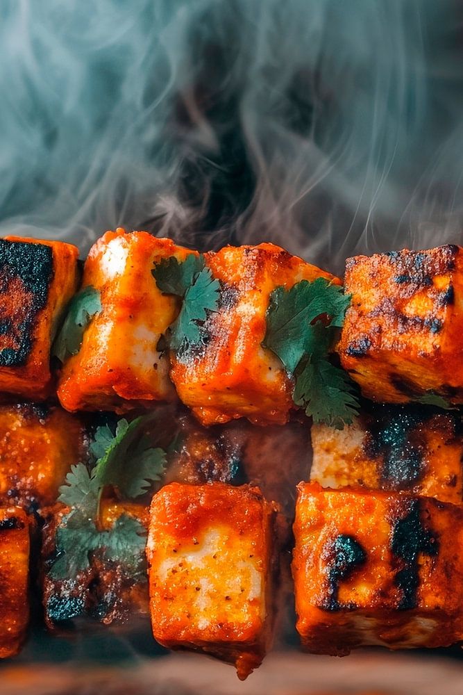 Ein verführerisches Spiel aus Rauch und leuchtenden Farben entfaltet sich hier: Saftige Spieße, die appetitlich auf Holzstäbchen drapiert sind, ziehen alle Blicke an. Der aromatische Dampf verspricht Genuss und Freude beim Kochen. Ideal für die Küche oder den Essbereich, wo das Herz für kulinarische Leidenschaft schlägt.