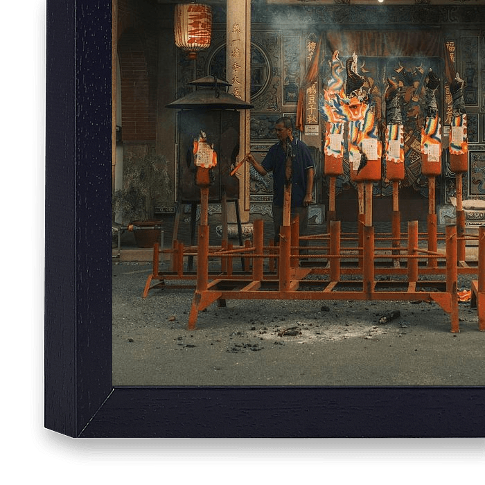 Dieses faszinierende Foto fängt die spirituelle Atmosphäre eines traditionellen chinesischen Tempels ein. Im Fokus stehen brennende Opfergaben, die vor der reich verzierten Tempelfassade platziert sind. Die aufsteigenden Rauchschwaden und das sanfte Licht verleihen der Szene eine meditative, fast mystische Ausstrahlung. Im Hintergrund sind die kunstvoll gestalteten Dachziegel, farbenfrohe Ornamente sowie aufwendige Drachen-Figuren zu erkennen, die für Glück und Schutz stehen. Tempel wie dieser sind zentrale Orte des Glaubens und der Gemeinschaft in vielen asiatischen Ländern. Das Bild vermittelt den Zauber asiatischer Religiosität, das Zusammenspiel von Farben, Symbolik und Tradition sowie die allgegenwärtige Verbindung von Spiritualität und Alltagsleben. Besonders ansprechend ist diese Szene für Liebhaber fernöstlicher Kultur, religiöser Zeremonien und kunstvoller Architektur. Das Motiv bringt eine Atmosphäre von Ruhe, Tiefe und kultureller Vielfalt in jedes Zuhause, Büro oder Restaurant. Es lädt dazu ein, in die Welt östlicher Rituale und jahrhundertealter Tempelbaukunst einzutauchen.