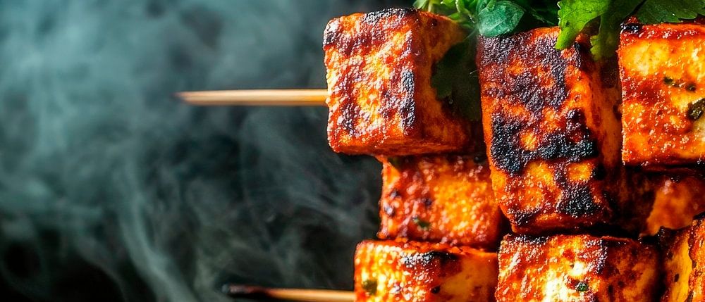 Leckere Grillkunst in Perfektion: Saftige, goldbraun geröstete Tofuwürfel auf Spießen, umgeben von aromatischen Kräutern, verströmen eine einladende, rauchige Duftnote. Dieses Bild ist eine köstliche Hommage an die mediterrane Küche und eignet sich hervorragend für die Küche oder das Esszimmer, um inspirierende Kochmomente zu schaffen.